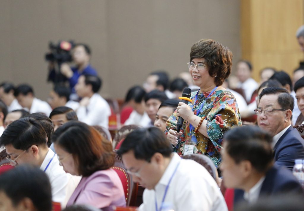 Thủ tướng tiếp tục trao đổi với Anh hùng Lao động Thái Hương tại giờ giải lao Hội nghị.